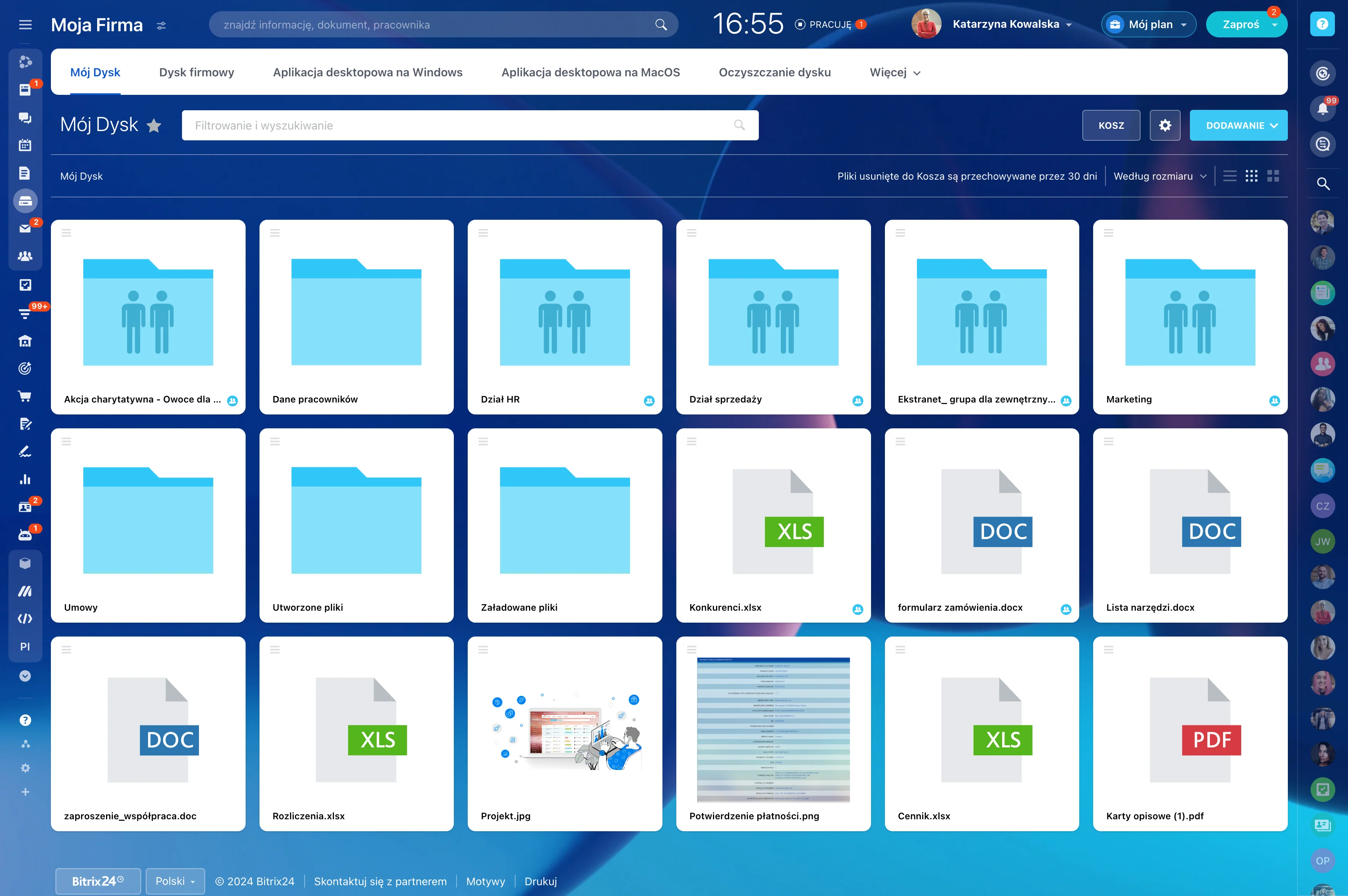 Bitrix24 zapewnia przechowywanie plików w chmurze, które pozwala tworzyć, edytować i udostępniać wszystkie pliki robocze. Łatwy dostęp z komputerów stacjonarnych i urządzeń mobilnych oraz integracja z Dokumentami Google i Office 365 oznacza, że dysk Bitrix24 wychodzi na przeciw Twoim potrzebom w zakresie współpracy nad projektami.