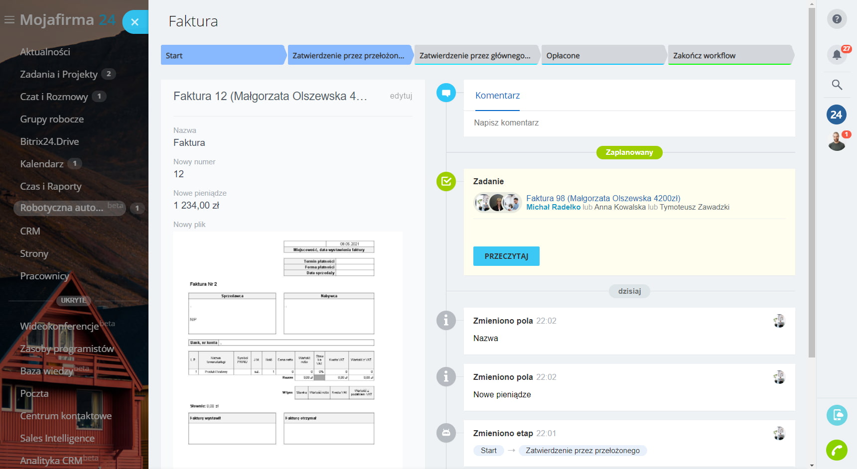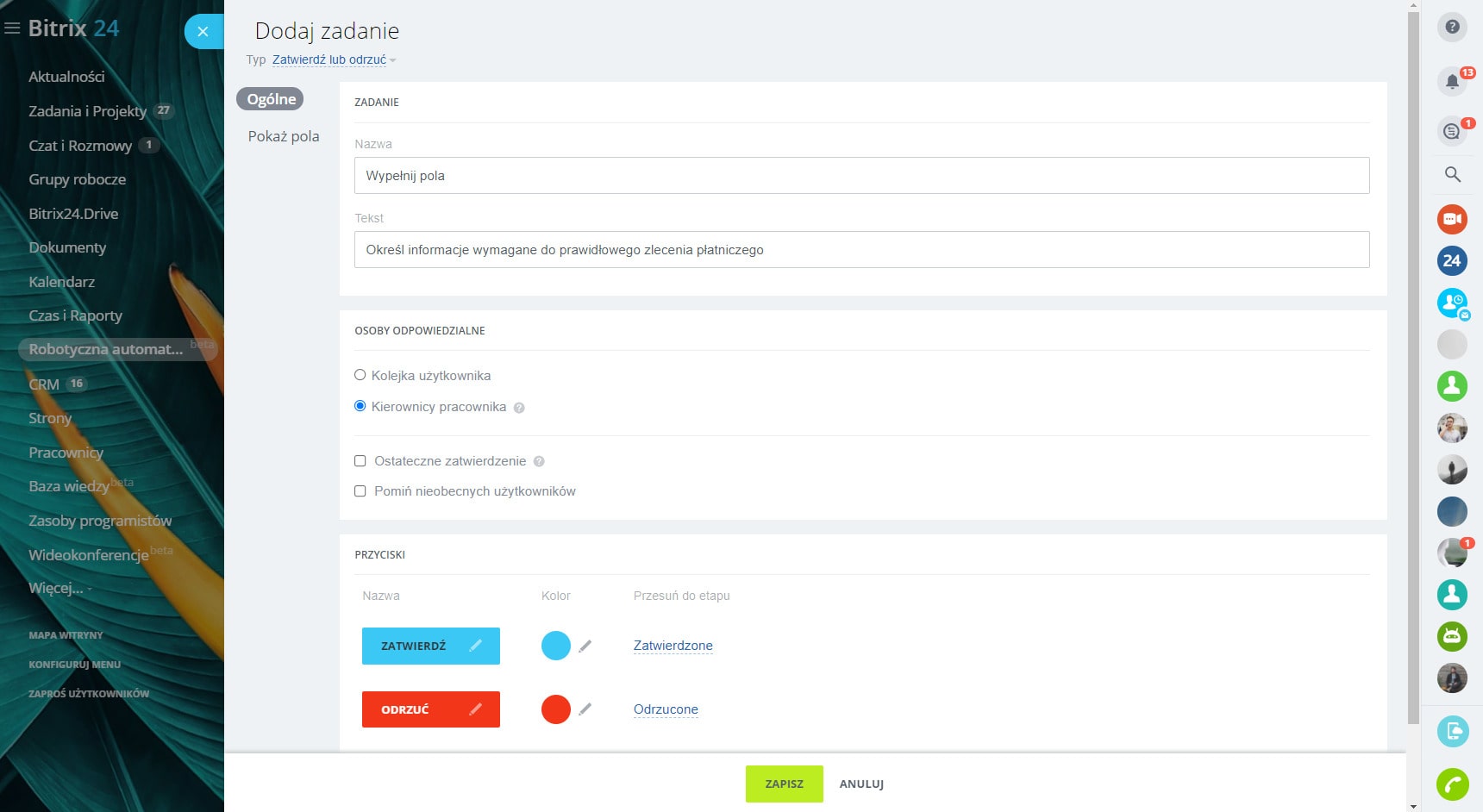 Zautomatyzowana robotyzacja procesów (RPA) w Bitrix24 pozwala zautomatyzować standardowe procesy biznesowe (zatwierdzanie dokumentów, zlecenia zakupu, raporty dotyczące wydatków itp) i zaoszczędzić nawet do 80% czasu podczas realizacji rutynowych zadań.