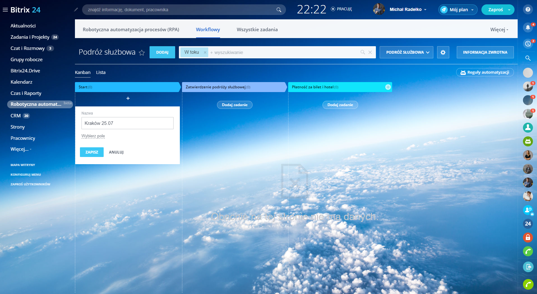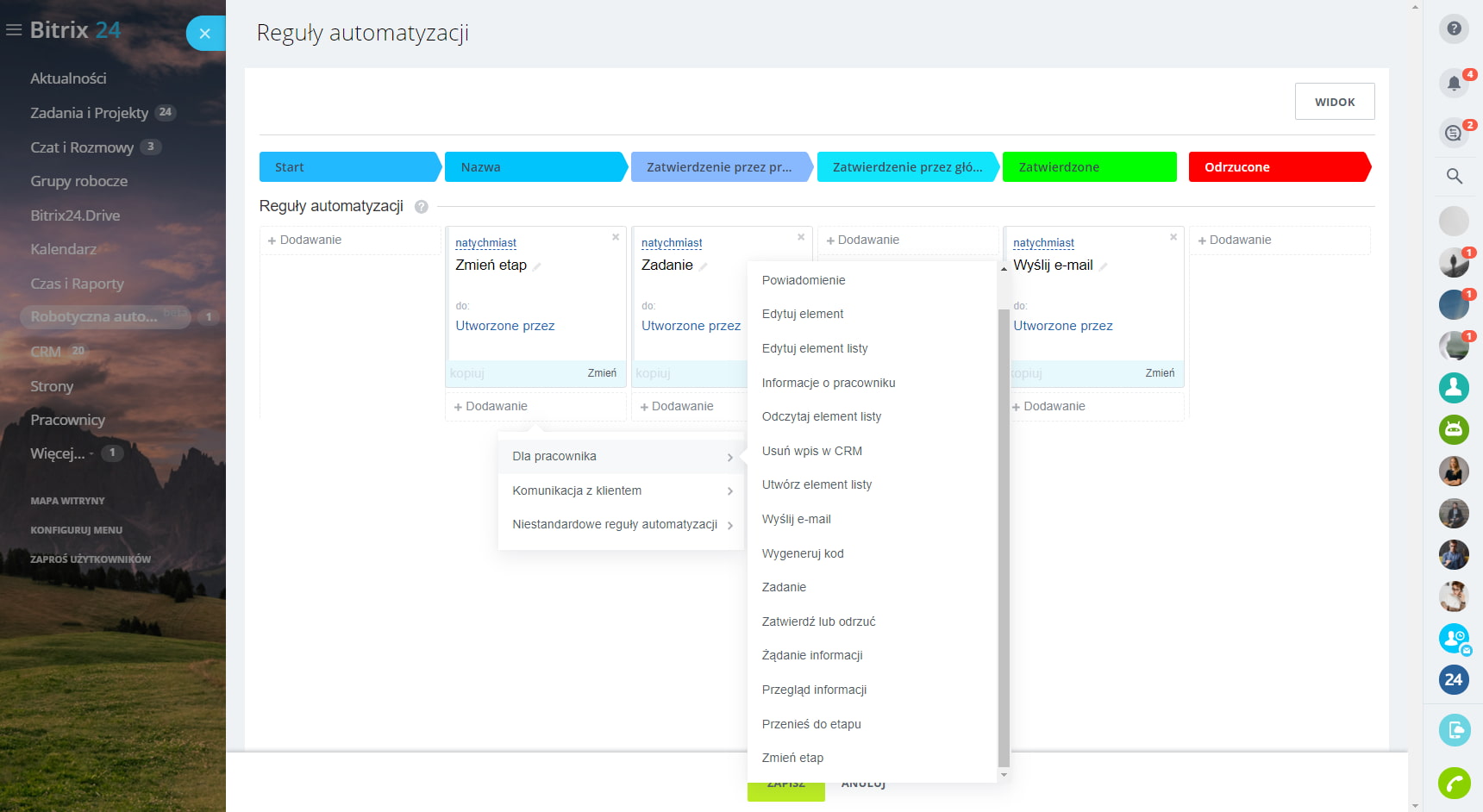 Możesz zautomatyzować wiele standardowych, rutynowych działań, takich jak tworzenie zadania, zmiana etapu w Kanban, zmiana statusu zadania, osoby odpowiedzialnej, wysyłanie powiadomienia lub wiadomości e-mail do konkretnego pracownika i nie tylko.