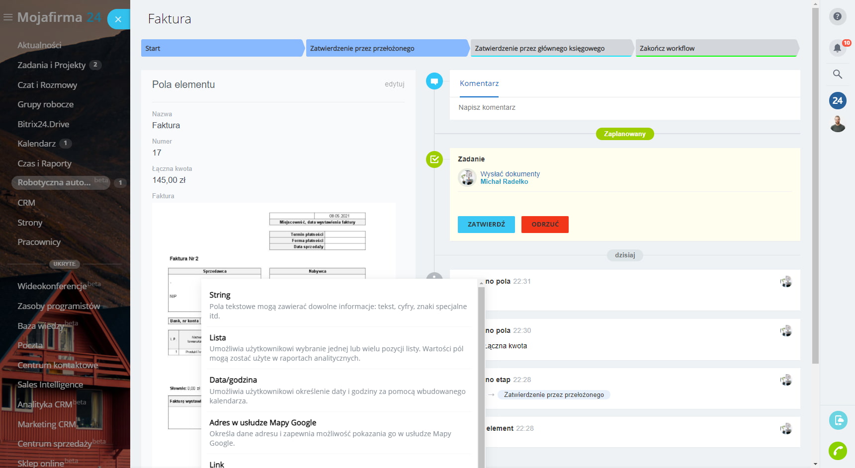Zadania można tworzyć automatycznie na podstawie konkretnych wyzwalaczy i działań w CRM (na przykład, kiedy deal jest przeniesiony do kolejnego etapu, utworzone zostaje nowe zadanie dotyczące utworzenia i wysłania klientowi faktury).