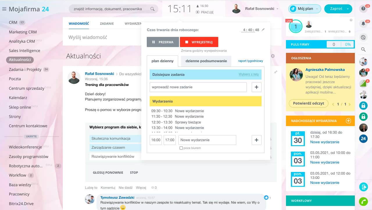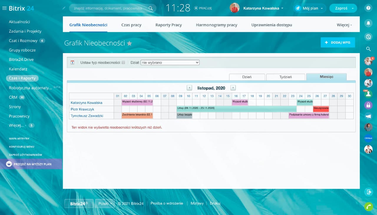 Funkcja harmonogramu pracy w Bitrix24 pozwala ustawić czas rozpoczęcia i zakończenia pracy, dni robocze i przerwy oraz czas ich trwania. Świetnie sprawdza się to, jako narzędzie do zarządzania obciążeniem pracą w zespołach, które pracują na zmiany.
