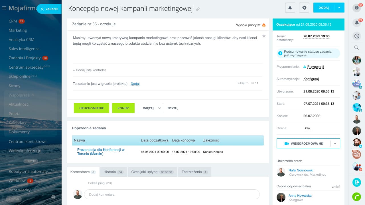 Wszystkie zadania przypisane do konkretnej osoby są automatycznie monitorowane, aby dowiedzieć się, ile z nich ukończono sprawnie i na czas. Wydajność w zakresie zadań możesz sprawdzić dla poszczególnych pracowników i działów.