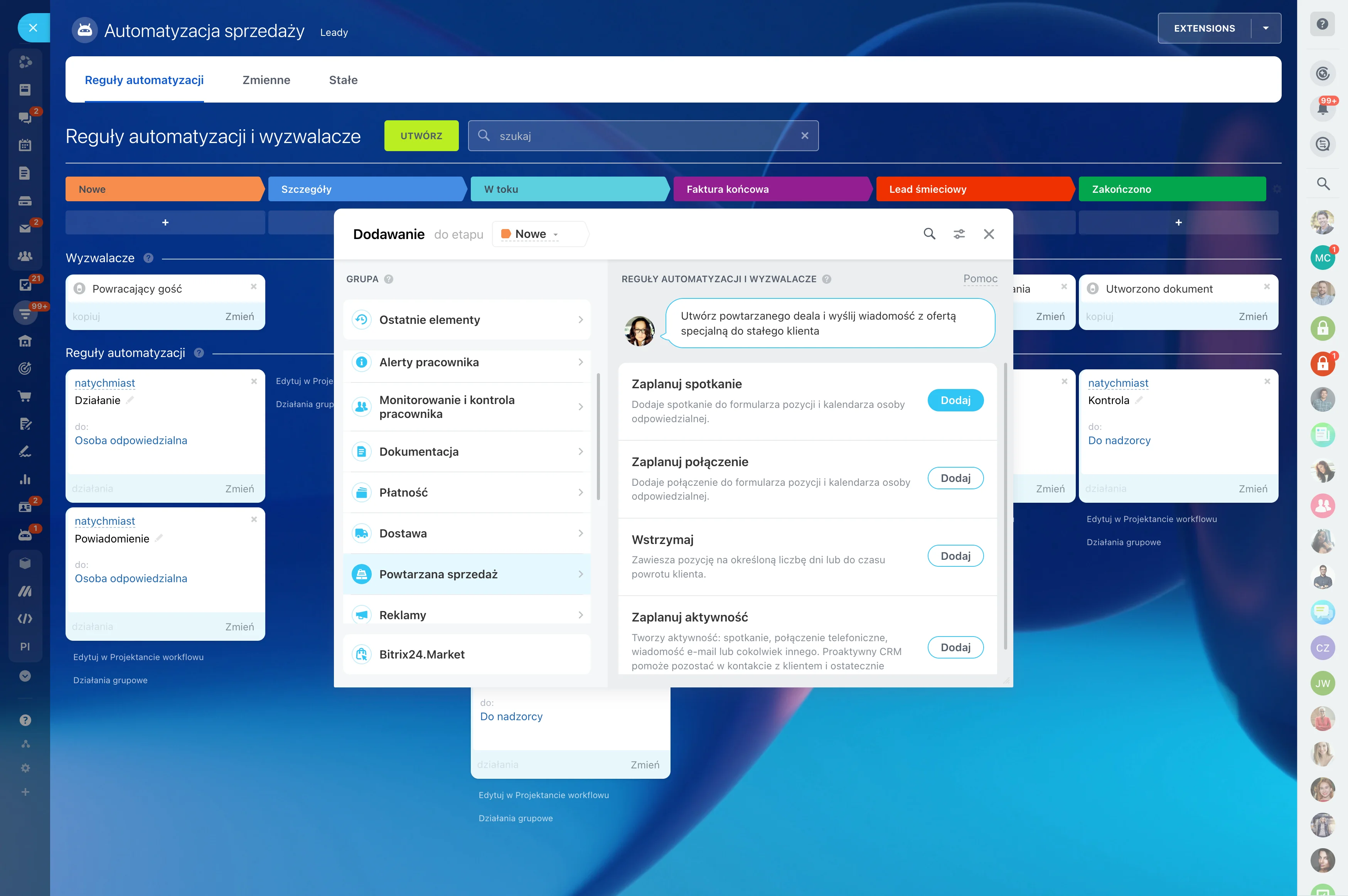 Skonfiguruj regułę automatyzacji (na przykład „wyślij wiadomość e-mail lub SMS do klienta”), która zostanie aktywowana, kiedy lead (lub deal) zyska nowy status w lejku sprzedażowym. Reguły automatyzacji powodować konkretny czas aktywacji i działanie: zadanie, powiadomienie, wiadomość e-mail, połączenie telefoniczne lub inne.